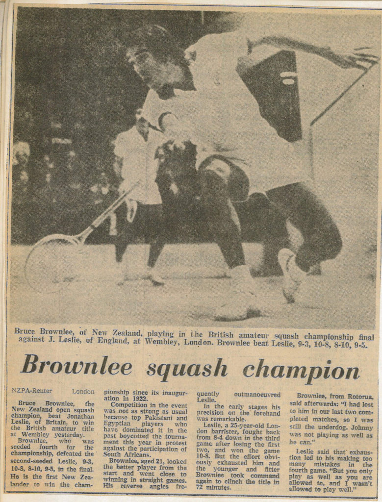 Bruce Brownlee, the New Zealand open squash champion, beat Jonathon Leslie, of Britain, to win the British amateur title at Wembley yesterday. Brownlee, who was seeded fourth for the championship, defeated the second-seeded Leslie, 9-3, 10-8, 8-10, 9-5, in the final. he is the first New Zealander to win the championship since its inauguration in 1922.