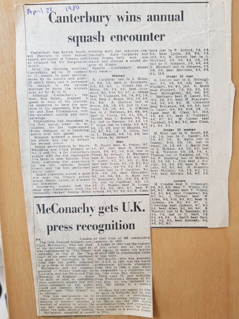 R. Hayes beat R. Foster 9-7, 1-9, 9-7, 10-9; beat R. Fitzsimmons 3-1. B. Simpson lost to Fitzsimmons 6-9, 9-5, 5-9, 8-10; lost to Foster by default. B. Matthews beat K. Leary 9-4, 9-4, 9-5; beat R. Grant 9-2, 9-7, 9-0. C. Hibbert beat Grant 9-2, 5-9, 9-1, 9-5; beat Leary 4-9, 9-4, 9-6, 9-1. D. Preston lost to B. Gardiner 9-1, 8-10, 6-9, 3-9; beat J. Dancaster 9-2, 4-9, 9-6, 9-4. N. Rush lost to Dancaster 9-1, 10-8, 6-9, 8-10, 2-9; lost to Gardiner 6-9, 1-9, 4-9. C. Wasley beat D. Lyons 3-9, 9-4, 6-9, 10-8, 9-7; beat P. Arnold 6-9, 9-7, 9-2, 9-1. R. Clements lost to Arnold 7-9, 5-9, 6-9; beat Lyons 6-9, 9-5, 5-9, 10-8, 9-4. H. Dowell lost to G. Morrison 4-9, 9-6, 9-4, 2-9, 3-9; lost to N. Simpson 3-9, 4-9, 4-9. R. Marshall lost to Simpson 3-9, 3-9, 3-9; beat Morrison 9-5, 6-9, 9-5, 10-9.