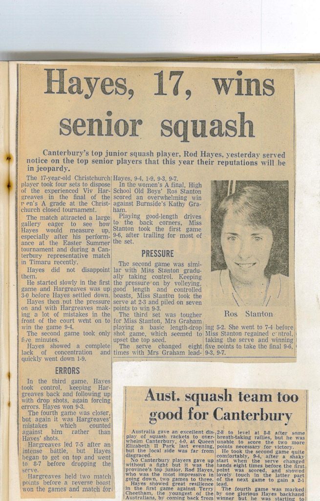 In the women’s A final, High School Old Boys’ Ros Stanton scored an overwhelming win against Burnside’s Kathy Graham. Playing good length drives to the back corners, Miss Stanton took the first game 9-6 after trailing for most of the set. The second game was similar with Miss Stanton gradually taking control. Keeping the pressure on by volleying, good length and controlled boasts, Miss Stanton too the serve at 2-3 and piled on seven points to win 9-3.