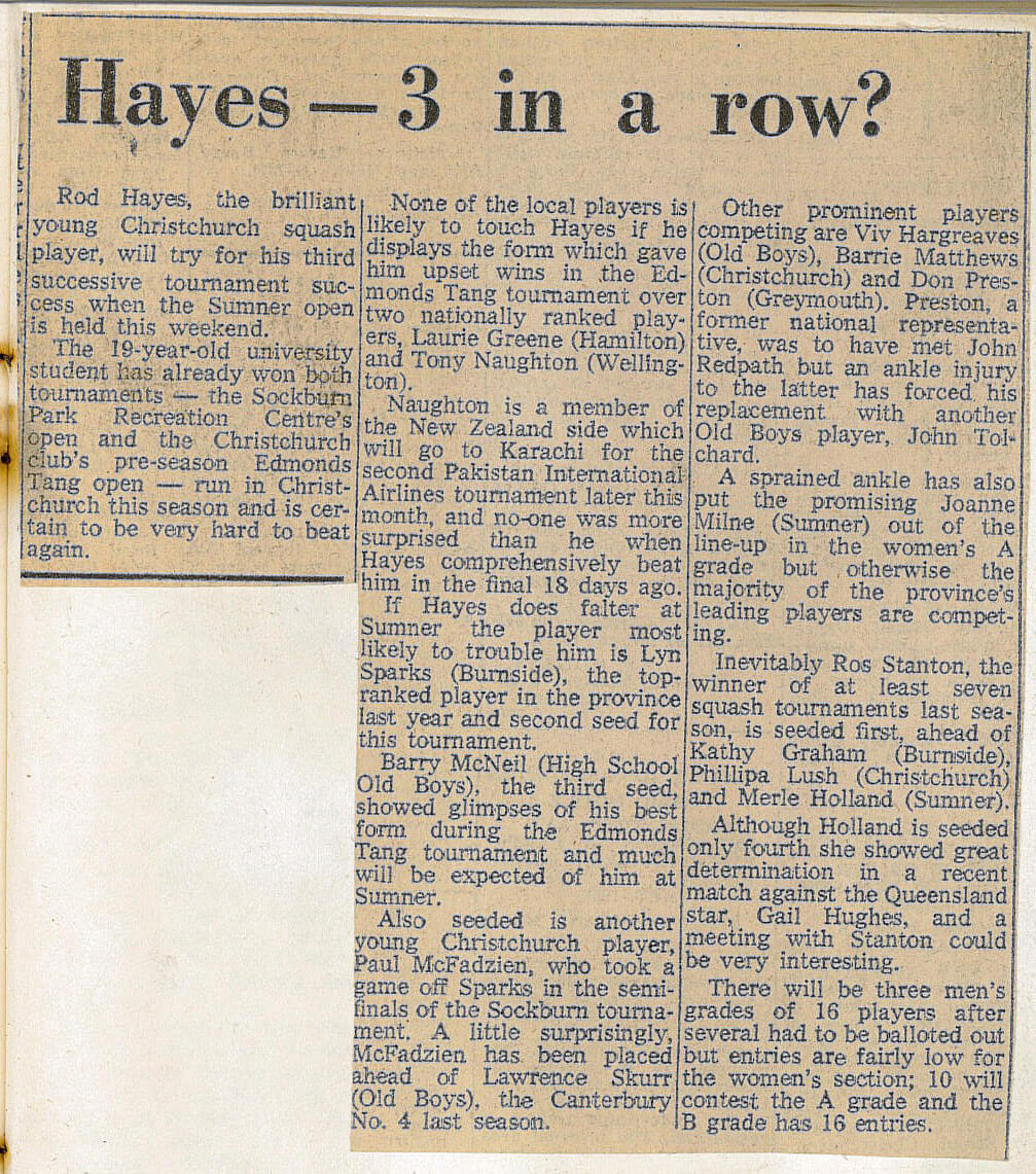 Rod Hayes, the brilliant young Christchurch squash player, will try for his third successive tournament success when the Sumner open is held this weekend.