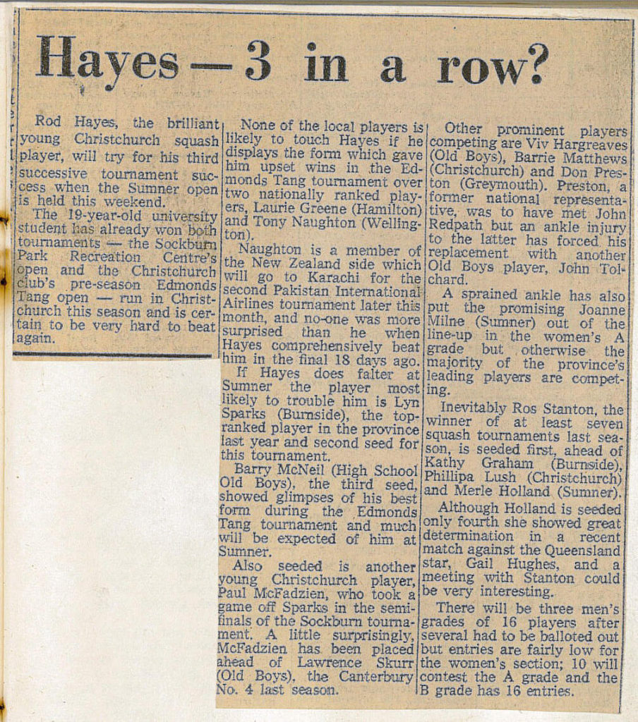 Also seeded is another young Christchurch players, Paul McFadzien, who took a game off Sparks in the semi-finals of the Sockburn tournament. A little surprisingly, McFadzien has been placed ahead of Lawrence Skurr (Old Boys), the Canterbury No.4 last season.