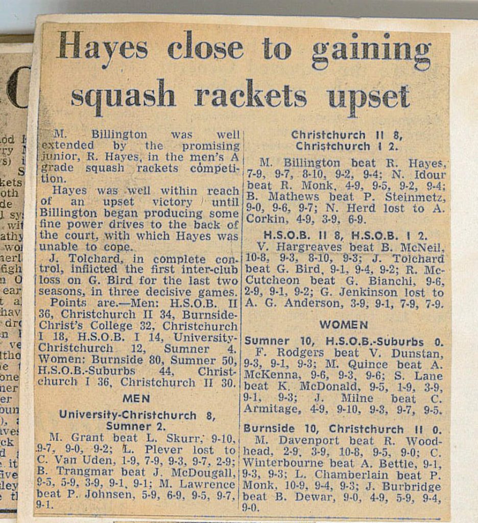 M. Billington was well extended by the promising junior, R, Hayes, in the men’s A grade squash rackets competition.