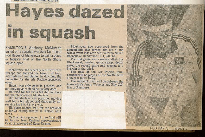 Hamilton’s Anthony McMurtrie pulled off a surprise win over No.1 seed Rod Hayes of Manurewa to gain a place in today’s final of the North Shore squash open. McMurtrie has recently returned from Europe and showed the benefit of hard international matchplay in downing the favourite for the Air Pacific sponsored event. Hayes was only good in patches and not moving as well as he usually does.He tried for his shots but did not have the match fitness of McMurtrie. But McMurtrie was positive, moving well for a big player and thoroughly deserving his 9-5,9-6,9-1 win.His form augurs well for the national under 23 championships in Nelson next week. McMurtie’s opponent in the final will be former New Zealand representative Craig Blackwood of Eden-Epsom. Blackwood, now recovered from the appendicitis that forced him out fo the world event last year beat veteran Neven Barbour of Henderson 10-8,9-0,9-5. The first game was a seesaw affair but Blackwood looking quite sharp, dominated the second game and coasted to a 9-5 win in the third. The final of the Air Pacific tournament will be played at the North Shore club at 3.45pm today.The women’s final will be between the home club’s Jenny Webster and Kay Collins of Panmure.