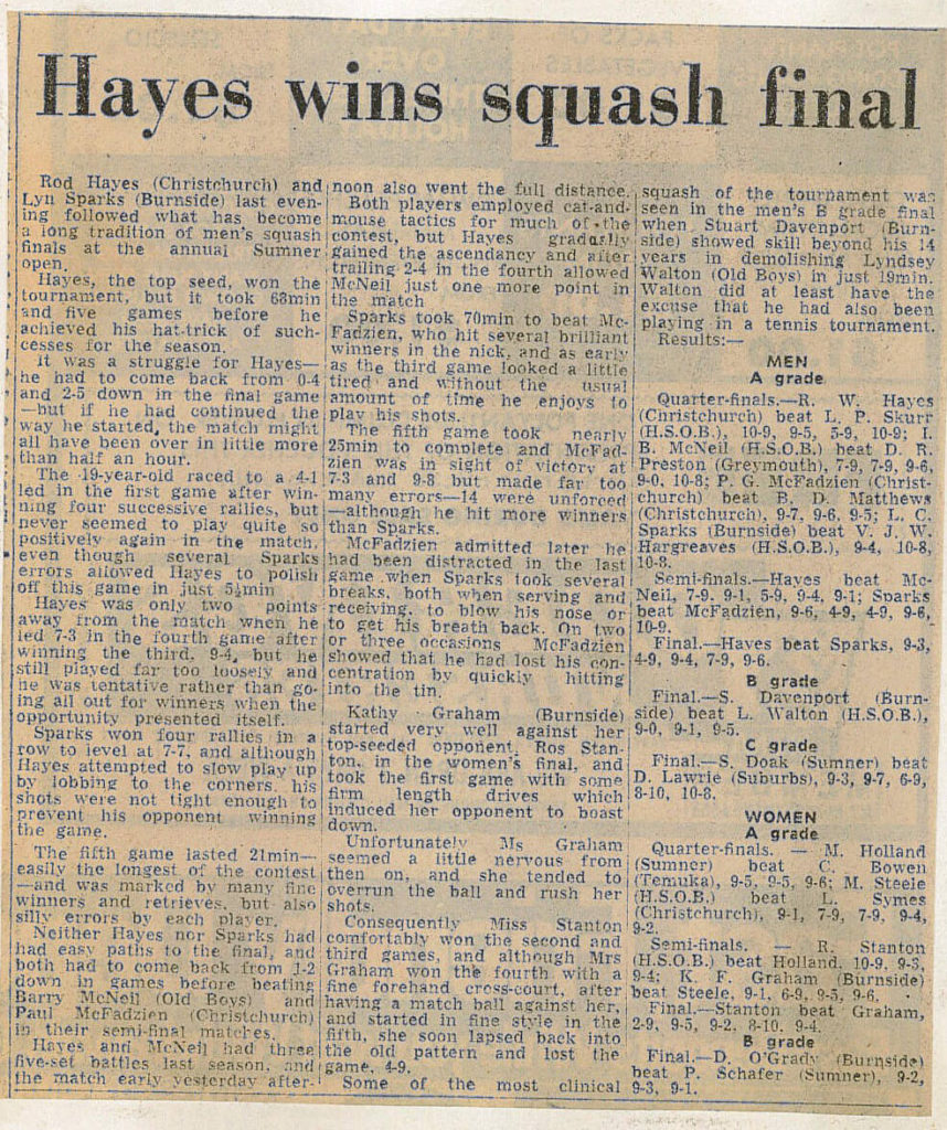 Rod Hayes (Christchurch) and Lyn Sparks (Burnside) last evening followed what has become a long tradition of men’s squash finals at the annual Sumner open.