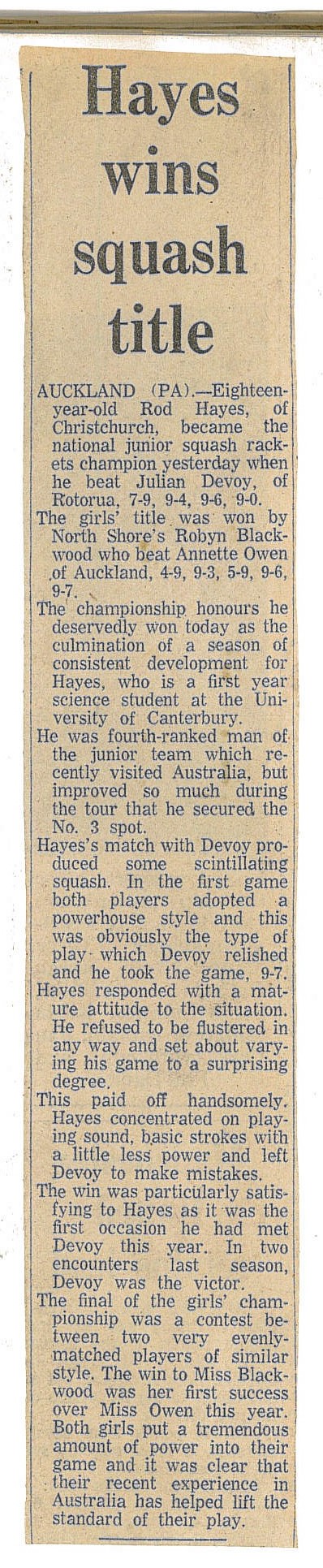 Eighteen-year old Rod Hayes, of Christchurch became the national junior squash rackets champion yesterday when he beat Julian Devoy of Rotorua, 7-9 9-4 9-6 9-0. The girls’ title was won by Robyn Blackwood who beat Annette Owen of Auckland, 4-9 9-3 5-9 9-6 9-7