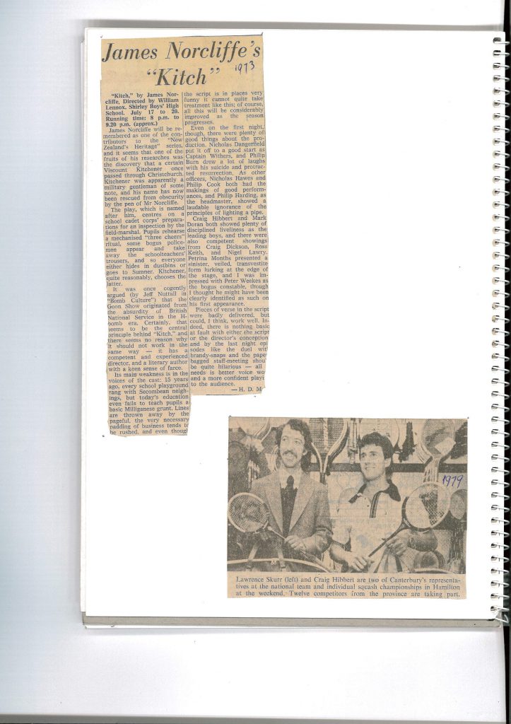 James Norcliffe will be remembered as one of the contributors to the “New Zealand Heritage” series, and it seems that one of the fruits of his researches was the discovery that a certain Viscount Kitchener once passes through Christchurch. Kitchener was apparently a military gentleman of some note, and his name has now been rescued from obscurity by the pen of Mr Norcliffe. The play, which is named after him, centres on a school cadet corps’ preparations for an inspection by the field-marshal. Pupils rehearse a mechanised “three cheers” ritual, some bogus policemen appear and take away the school teachers trousers and so everyone either hides in dustbins or goes to Sumer. Kitchener quite reasonably, chooses the latter.