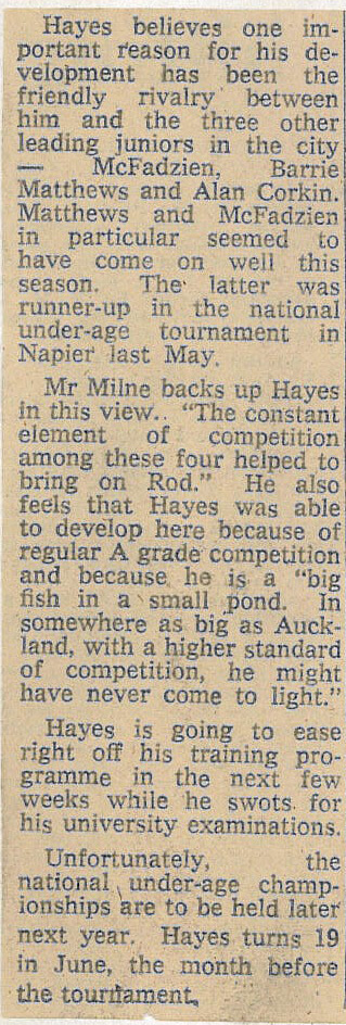 Hayes believes one important reason for his development has been the friendly rivalry between him and the three other leading juniors in the city – McFadzien, Barrie Matthews, and Alan Corkin. Mathews and McFadzien in particular seemed to have come on well this season. The latter was runner-up in the national under-age tournament in Napier last May.