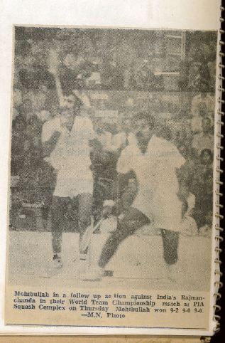 Mohibullah in a follow up action against India’s Rajmanchanda in their World Team Championship match at PIA Squash Complex on Thursday Mohibullah won 9-2,-9-0,9-0.