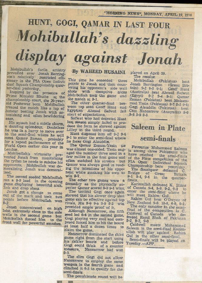 Mohibullah’s facile artistry prevailed over Jonah Barrington’s relatively restricted efficiency in the PIA Open individual Squash Championships quarter-final yesterday.Inspired by the presence of Prime Minister Bhutton at the championship court, the 20 year-old Peshwar born Mohibullah treated the match like a lap of honour beating Jonah with astonishing and often bewildering ease. His squash had a subtle charm, a dazzling splendour. Doubtless he was in a hurry to move over to the semi-final where he will meet Qamar Zaman, probably for a repeat performanceof the World Open earlier this year in London.Mohibullah’s virtuosity prevented Jonah maintaining the rhythm he needs to subdue his opponents Mohibullah was demoralising Jonah was demoralised.The second seeded Mohibullah ran a 8-0 lead in the opening game displaying beautiful nick, link and drop shots.Jonah got a change to come out of the mark and took two points before Mohibullah won 9-2.Jonah concentrated on high lobs, extremely close to the side walls in the second game but Mohibullah forced him to the front wall for powerful smashes.This time he conceded three points to Jonah and then countering his opponents side wall shots with deceptive nicks Mohibullah took the game and the match 9-1.The other quarter-final between top seed Geoff Hunt and Egyptian Ahmad Safwat fell short of expectations.Safwat who has defeated Hunt last season simply failed to produce the form he showed against Lilley in the third round.Hunt disposed him off 9-2,9-4,9-1 to enter the semi-final where he faces Gogi Aluddin.The Qamar Zaman-Yasin tie was almost one-sded. Yasin engaged the number three seed in a dew rallies in the first game and often matched his strokes but Qamar was alwaysgood in reading the intentions of his opponent while masking his own to win 9-7.The other two games were a formality as the physically superior Qamar scroed 9-3,9-1 wins.The tactical Gogi once again showed that his slower drop shot games can be effective against top rivals. His 9-0,9-6,3-9,9-3 win provided ample proof of it. Although Nancarrow, the fifth seed lead 6-4 in the second game, Gogi playing a very cool and composed forced him to hit the board at least half a dozen times to claim the game. Nancoarow dominated the third game right from the start using his tickler boasts and before Gogi could think of a counter measure, Nancarrow had won 9-3. The skim Gogi did not allow Nancarrow to employ the sane weapon in the fourth game and clinched it 9-3 to qualify for the semi-finals. The penultimate round will be played on April 20.The results. Mohibullah (Pakistan) beat Jonah Barrington (Great Britain) 9-2,9-3,9-1; Geoff Hunt (Australia) beat Ahmad Safwat (Egypt) 9-2,9-4,9-1; Qamar Zaman (Pakistan) beat Mohibullah Yasin (Pakistan) 9-7,9-3,9-1: Gogi Aluddin (Pakistan) beat Cam Nancarrow (Australia) 9-0,9-6,3-9,9-3.