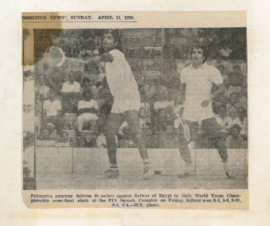 Pakistan’s amateur Saleem in section against Safwat of Egypt in their World Team Championship semi-final clash at the PIA Squash Complex on Friday. Safwat won 9-3,3-9,9-10,9-8,9.4.