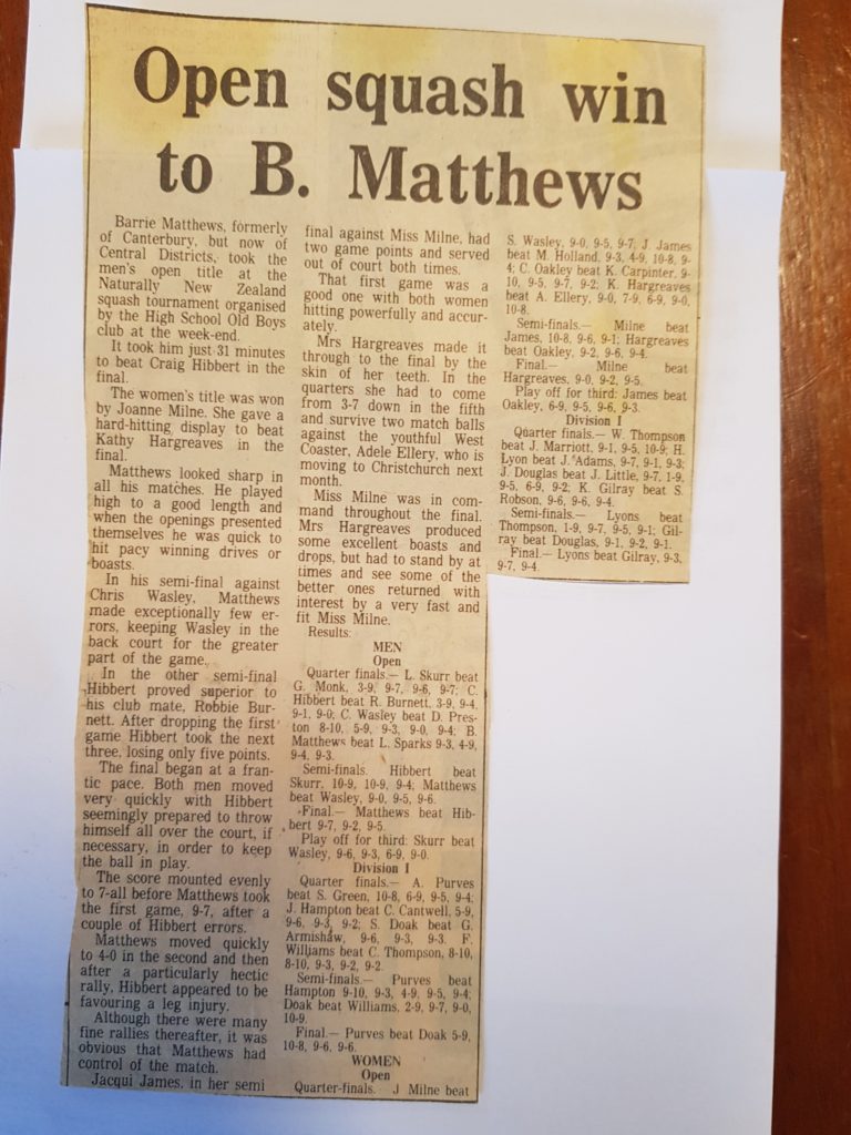 Barrie Matthews, formerly of Canterbury, but now of Central Districts, took the men’s open title at the Naturally New Zealand squash tournament organised by the High School Old Boys club at the weekend.