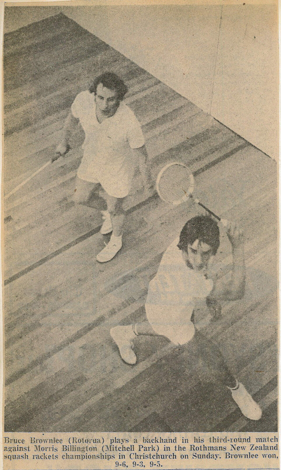 Bruce Brownlee (Rotorua) plays a backhand in his third-round match against Morris Billington (Mitchell Park) in the Rothmans New Zealand squash rackets championships in Christchurch on Sunday. Brownlee won, 9-6, 9-3, 9-5.