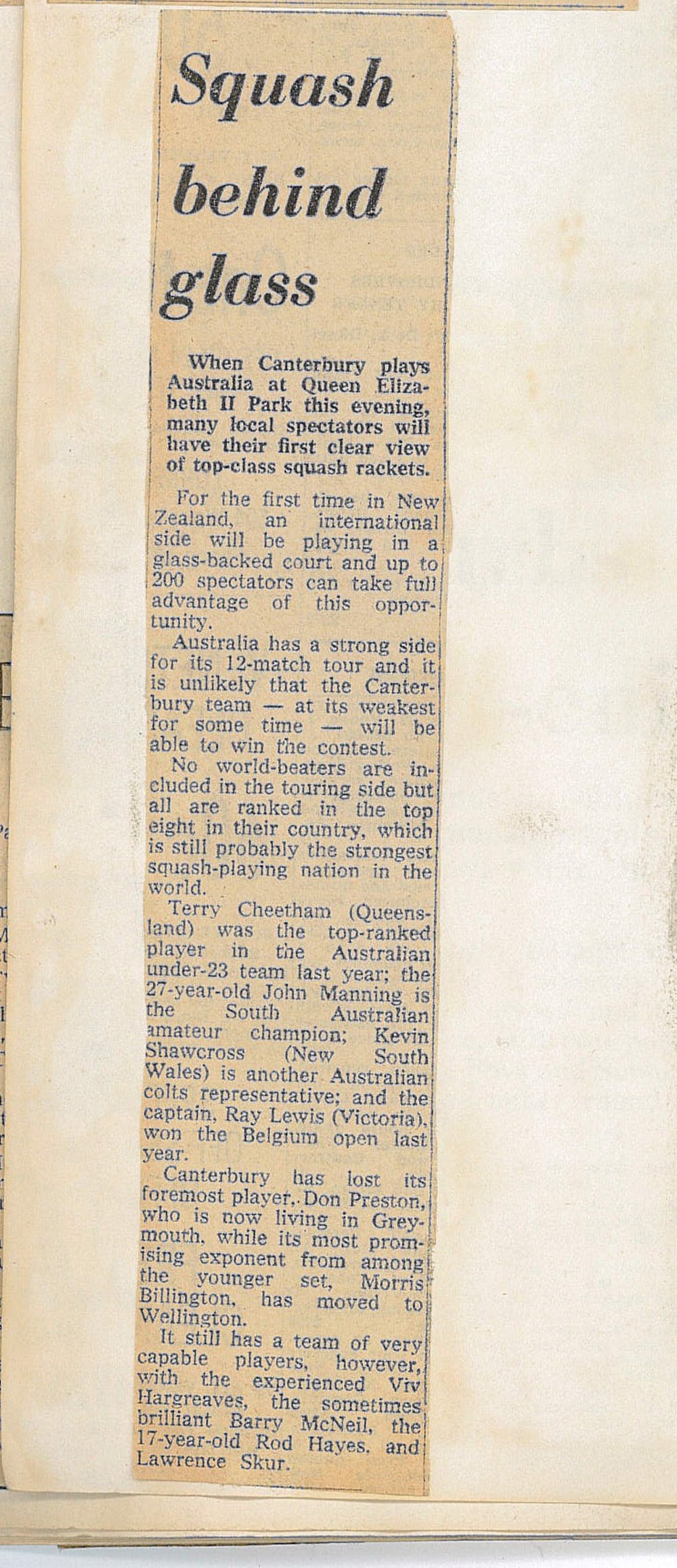 When Canterbury plays Australia at Queen Elizabeth II Park this evening, many local spectators will have their first clear view of top-class squash rackets.For the first time in New Zealand, an international side will be playing in a glass-backed court and up to 200 spectators can take full advantage of this opportunity.Australia has a strong side for its 12 match tour and it is unlikely that the Canterbury team – at its weakest for some time – will be able to win the contest.No world-beaters are included in the touring side but all are ranked in the top eight in their country, which is still probably the strongest squash-playing nation in the world.Terry Cheetham (Queensland) was top-ranked player in the Australian under-23 team last year; the 27 year old Joh Manning is the South Australia amateur champion;Kevin Shawcross (New South Wales) is another Australian colts representative’ and the captain, Ray Lewis (Victoria) won the Belgium open last year.Canterbury has lost its foremost player Don Preston who is now living in Greymouth, while its most promising exponent from among the younger set, Morris Billington, has moved to Wellington.It still has a team of very capable players, however with the experienced Viv Hargreaves, the sometimes brilliant Barry McNeil and 17 year old Rod Hayes and Lawerence Skur.