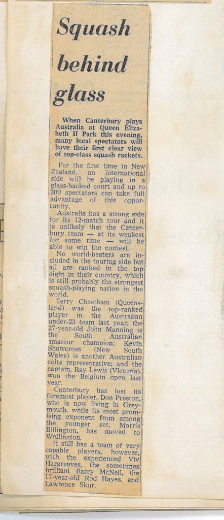 When Canterbury plays Australia at Queen Elizabeth II Park this evening, many local spectators will have their first clear view of top-class squash rackets.For the first time in New Zealand, an international side will be playing in a glass-backed court and up to 200 spectators can take full advantage of this opportunity.Australia has a strong side for its 12 match tour and it is unlikely that the Canterbury team – at its weakest for some time – will be able to win the contest.No world-beaters are included in the touring side but all are ranked in the top eight in their country, which is still probably the strongest squash-playing nation in the world.Terry Cheetham (Queensland) was top-ranked player in the Australian under-23 team last year; the 27 year old Joh Manning is the South Australia amateur champion;Kevin Shawcross (New South Wales) is another Australian colts representative’ and the captain, Ray Lewis (Victoria) won the Belgium open last year.Canterbury has lost its foremost player Don Preston who is now living in Greymouth, while its most promising exponent from among the younger set, Morris Billington, has moved to Wellington.It still has a team of very capable players, however with the experienced Viv Hargreaves, the sometimes brilliant Barry McNeil and 17 year old Rod Hayes and Lawerence Skur.