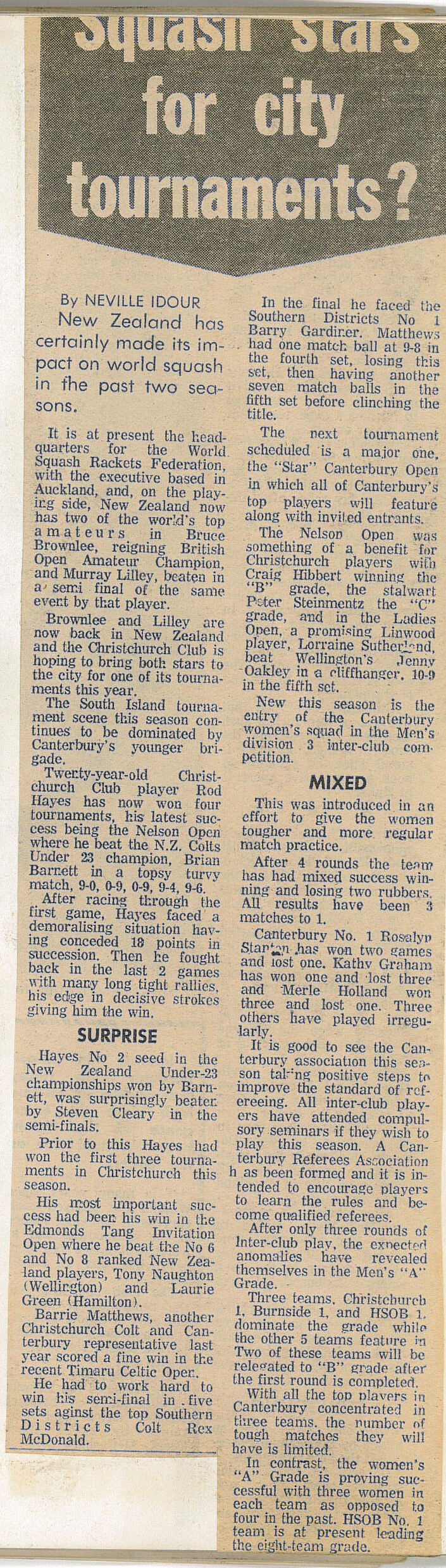 His most important success had been his win in the Edmonds Tang Invitation Open where he beat the No 6 and No 8 ranked New Zealand players, Tony Naughton (Wellington) and Laurie Green (Hamilton). Barrie Matthews, another Christchurch Colt and Canterbury representative last year scored a fine win in the recent Timaru Celtic Open.