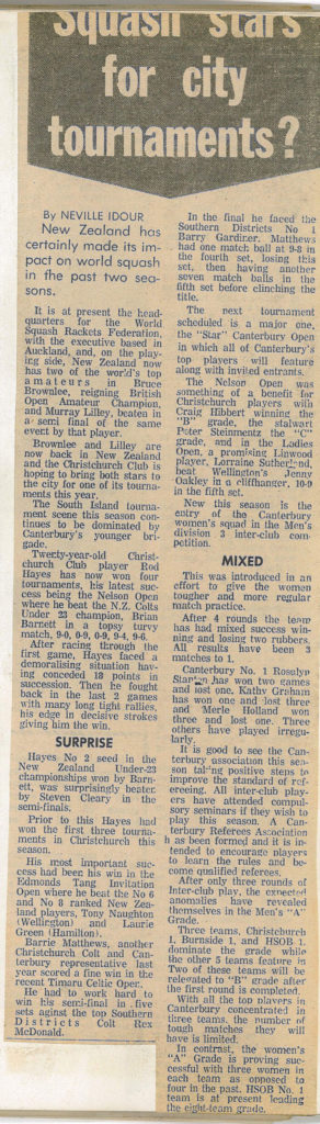 It is at present the head-quarters for the World Squash Rackets Federation, with the executive based in Auckland, and on the playing side, New Zealand now has two of the world’s top amateurs in Bruce Brownlee, reigning British Open Amateur Champion, and Murray Lilley, beaten in a semi final of the same event by that player.