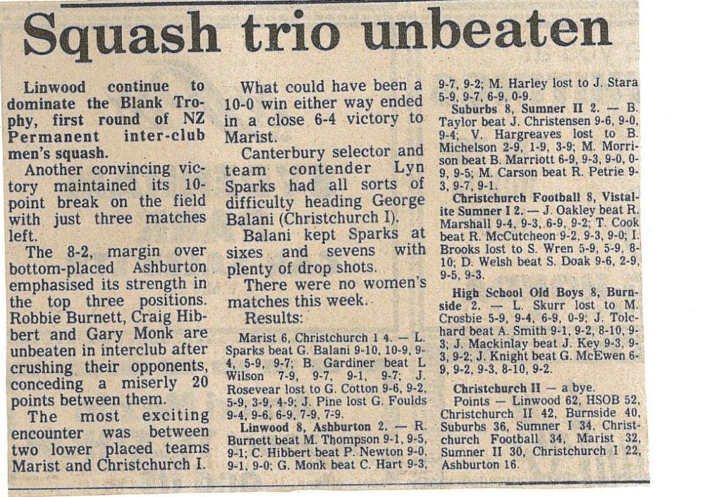 Marist 6 Christchurch 1 4: L Sparks beat G Balani 9-10 10-9 9-4 5-9 9-7; B Gardiner beat L Wilson 7-9 9-7 9-1 9-7; J Rosevear lost to G Cotton 9-6 9-2 5-9 3-9 4-9; J Pine lost to G Foulds 9-4 9-6 6-9 7-9 7-9.