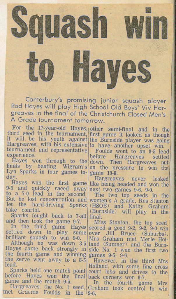 Canterbury promising junior squash player Rod Hayes will play High School Old Boys’ Viv Hargreaves in the final of the Christchurch Closed Men’s A Grade tournament tomorrow. For the 17-year-old Hayes, third seed in the tournament it will be his youth against Hargreaves, with his extensive tournament and representative experience.Hayes won through to the finals by beating Wigram’s Lyn Sparks in four games today. Hayes won the first game 9-5 and quickly raced away to a 7-0 lead in the second. But he lost concentration and let the har driving Sparks take control. Sparks fought back to 7-all and them took the game 9-7. In the third game Hayes settled down to play some brilliant squash to win 9-0. Although he was down 3-5 Hayes came back strongly in the fourth game and winning the serve went away to a 8-5 lead. Sparks held one match point before Hayes won the final game and the match 9-5.Hargreaves the No.1 seed met Graeme Foulds in the other semi-final and in the first game it looked as though theBurnside player was going to have another upset win. Foulds went to an 8-5 lead before Hargreaves settled down. Then Hargreaves put on the pressure to win the game 10-8. Hargreaves never looked like being headed and won the next two games 9-6, 9-0. The two top seeds in the women’s A grade. Ros Stanton (HSOB) and Kathy Graham (Burnside) will play in the final. Miss Stanton, the top seed scored a good 9-2,9-2,9-0 win over Jill Bruce (Suburbs). Mrs Graham met Merle Holland (Summer)and the Burnside No.1 won the first two games 9-5,9-6.However, in the third Mrs Holland with some fine cross court lobs and drives to the back corners won 9-7.In the fourth game Mrs Graham took control to win 9-6.