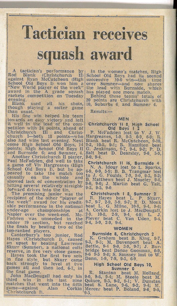 Another Christchurch player, Paul McFadzien did well to take a game off Viv Hargreaves (HSOB), but he appeared to take the match too casually on the whole and showed lack of concentration by hitting several relatively straight-forward drives in the tin. The promising junior was the recipient of the other “player of the week ” performance for his creditable performance in the national under-age championships at Napier over the weekend. McFadzien was unseeded in the under 19 section but reached the finals by beating two of the top ranked players.