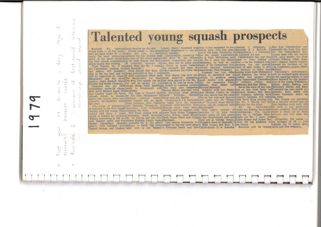 Chris Wasley, No. 8 on the Canterbury ranking list last season, will probably play in the top spot and he will be supported by Stuart Hargreaves and the three juniors, Jamie Bushell, Mark Crosbie and Robin Clements. Clements was the 1978 Canterbury under-19 champion while Bushell (aged 16) and Crosbie (aged 15) have already shown in tournaments this season their considerable development since last year.
