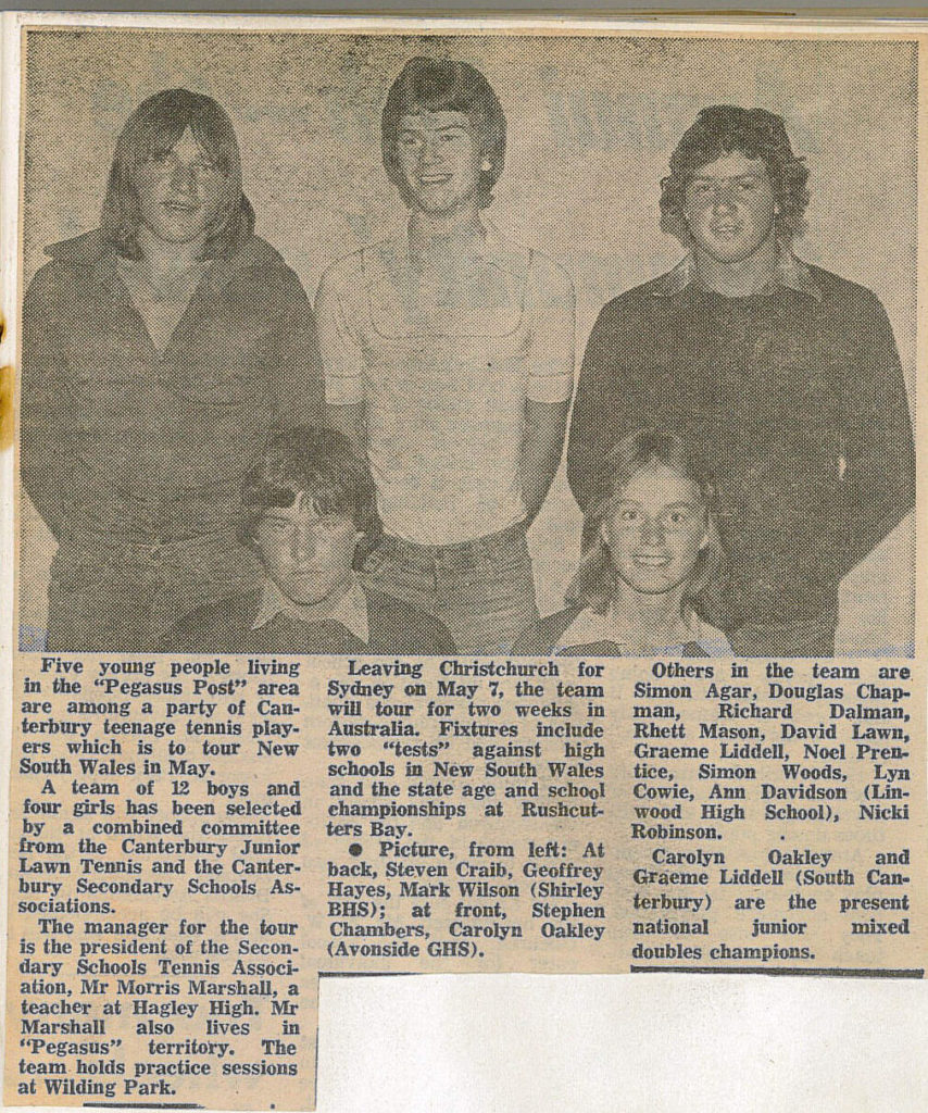Five young people living in the “Pegasus Post” area are among a party of Canterbury teenage tennis players which is to tour New South Wales in May.