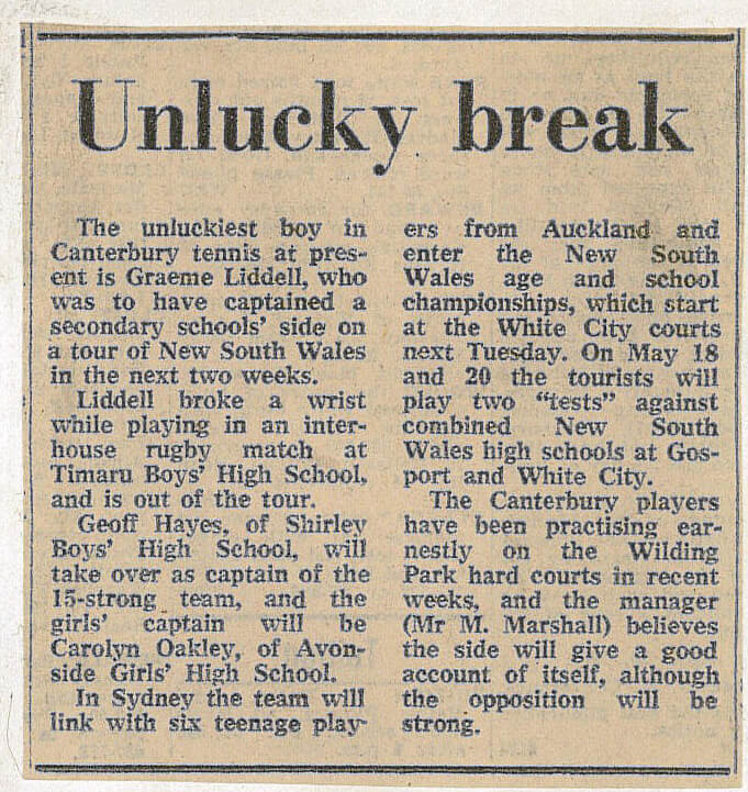The unluckiest boy in Canterbury tennis at present is Graeme Liddell, who was to have captioned a secondary schools’ side on a tour of New South Wales in the next two weeks.
